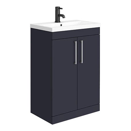 The contemporary matt blue Arezzo furniture range, with it’s clean lines this vanity unit is perfect for renewing the style in any bathroom. It’s stylish modern design hides all unsightly pipework creating a neat modern look. A internal shelf provides generous storage space for your toiletries, helping to keep your bathroom clutter free. Features eye-catching and stylish matt blue finish with on-trend modern polished chrome square bar handles.Â