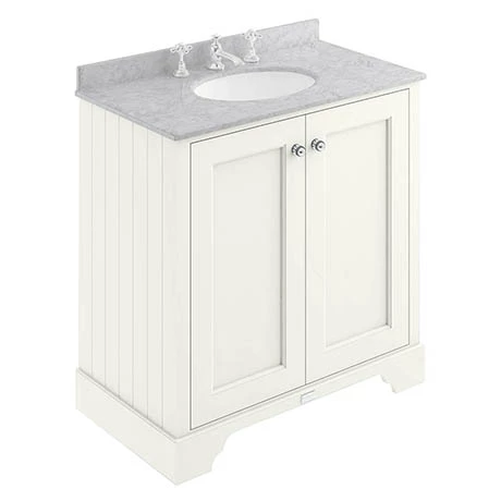 The Bayswater Pointing White 800mm 2 Door Vanity Unit and Grey Marble Basin Top will create a unique centre piece to any classic themed bathroom. It’s ample storage space provides plenty of room for bathroom essentials while the soft close doors limits the daily wear and tear and provides a quieter closing action. Made from high quality materials, it features side panelling for a classic look, elegant chrome knobs and a Bayswater logo plate that beautifully finishes the unit. The stunning grey marble top basin co-ordinates beautifully with the classic white china basin.