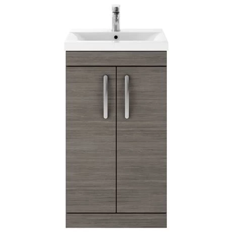 This 515mm wide Brooklyn Grey Avola Vanity Unit provides a clean and natural look in your bathroom. The grey textured Avola woodgrain gives the impression of authentic wood for a fraction of the price, while the colour contrasts elegantly with the bright white gloss basin. There’s ample room for toiletries behind the two soft close doors, designed to stop slamming and slow down wear and tear. The basin is made from durable vitreous china that will stand the test of time. Matt chrome handles on the doors are the final flourish on this compact basin vanity unit.