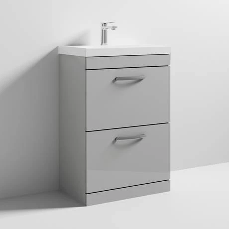 The Brooklyn modular furniture range combines up to date looks with practical storage. This 600mm floor standing vanity unit features 2 soft close drawers which provide plenty of storage space for toiletries, the Brooklyn vanity unit is perfect for adding modern style to any bathroom. This high quality gloss light grey vanity unit is supplied with a sleek gloss white thin-edge ceramic basin and quality matt chrome handles.