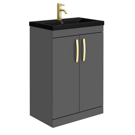 The Brooklyn modular furniture range combines up to date looks with practical storage. Features soft closing doors providing plenty of space for toiletries, the Brooklyn vanity unit is perfect for adding modern style to any bathroom. This high quality gloss grey vanity unit is supplied with a smooth matt black vitreous china basin and quality brushed brass handles.