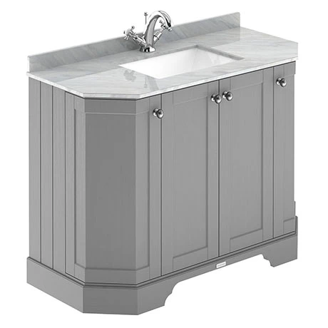 Old London furniture is the epitome of traditional design. This Art Deco styled Storm Grey 1000mm Angled Cabinet features soft close doors which limits the daily wear and tear and provides a quieter closing action. The luxury Grey polished marble top achieves a timeless, classic look. This art deco vanity unit is ideal for creating a period look in your bathroom, with it’s clean classical design blending beautifully with Old London’s range of traditional bathroom furniture.